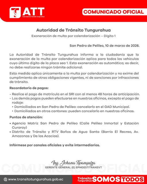 La Autoridad de Tránsito Tungurahua informa que la multa por calendarización queda exonerada automáticamente para todos los vehículos cuyo último dígito de placa sea 1. ✅ No debe realizarse ningún trámite adicional.